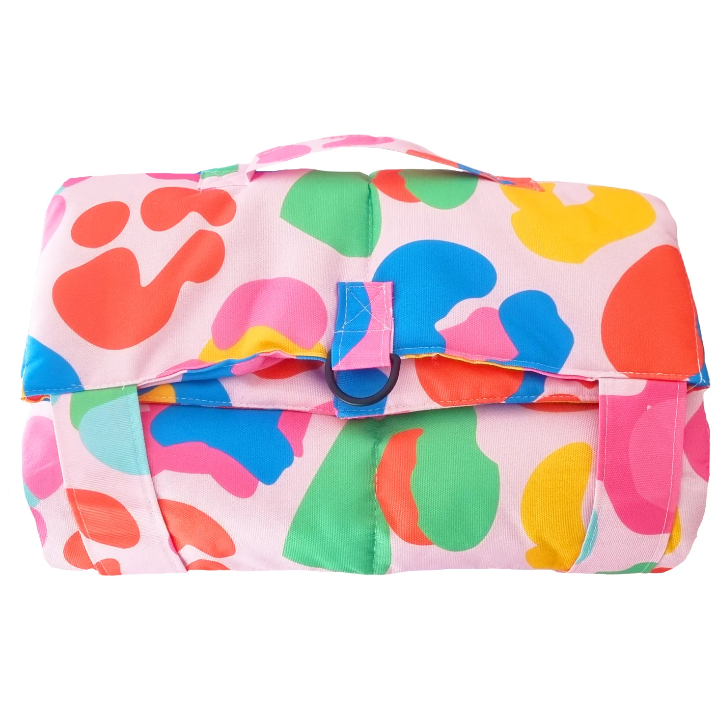 Our adventure mats can easily fold up and be secured in place with the velcro straps. Its lightweight and easy to grip handle also allows you to easily carry the mat to and from your fur babies outdoor activities.